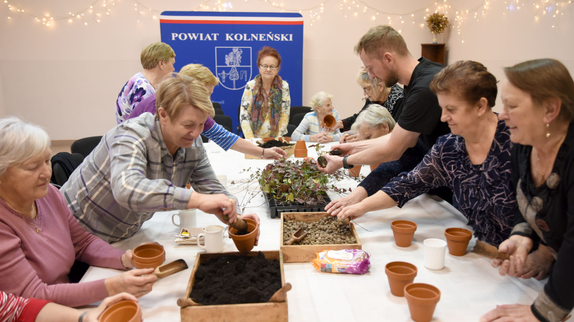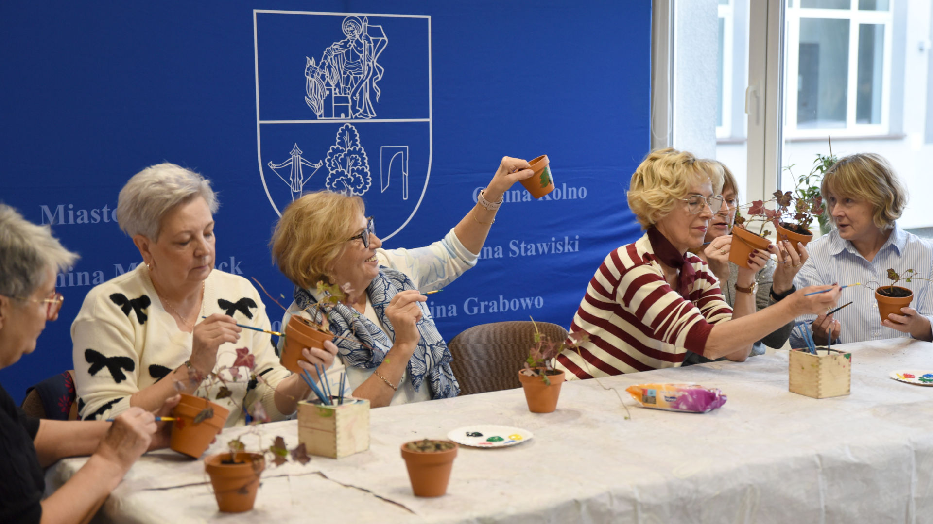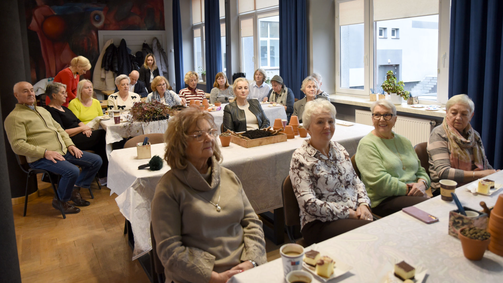 W drugiej części spotkania seniorzy mogli zaangażować się w działania praktyczne. Na przygotowanych stanowiskach sadzili bluszcz – roślinę o właściwościach antysmogowych, który następnie ozdabiali własnoręcznie malowanymi doniczkami. Dzięki temu każdy uczestnik zabrał do domu nie tylko wiedzę, ale również osobistą, ekologiczną pamiątkę. Seniorzy zgodnie podkreślali, że zdobyta wiedza i praktyczne umiejętności z pewnością przydadzą im się na co dzień.