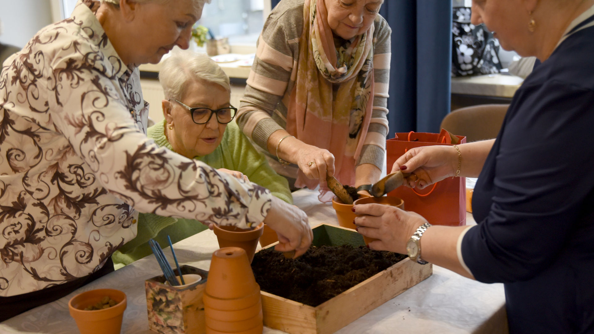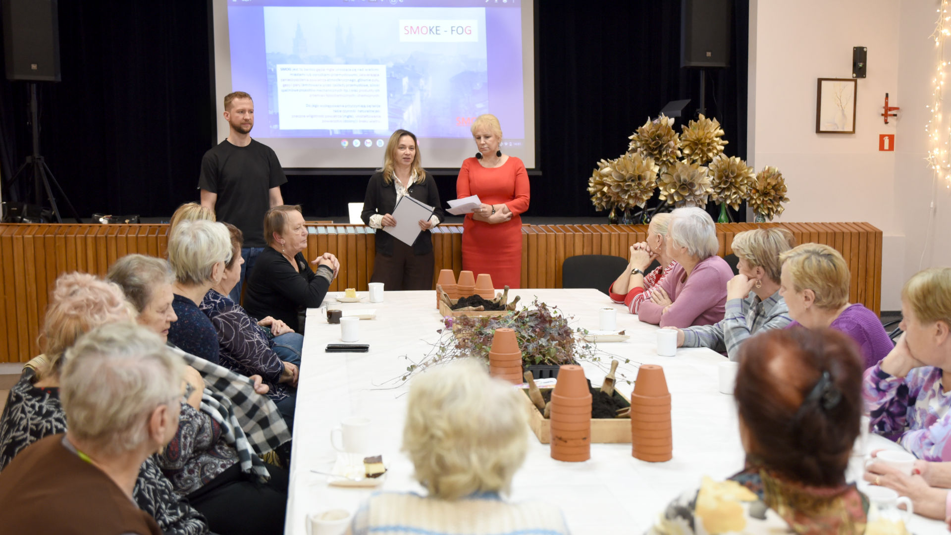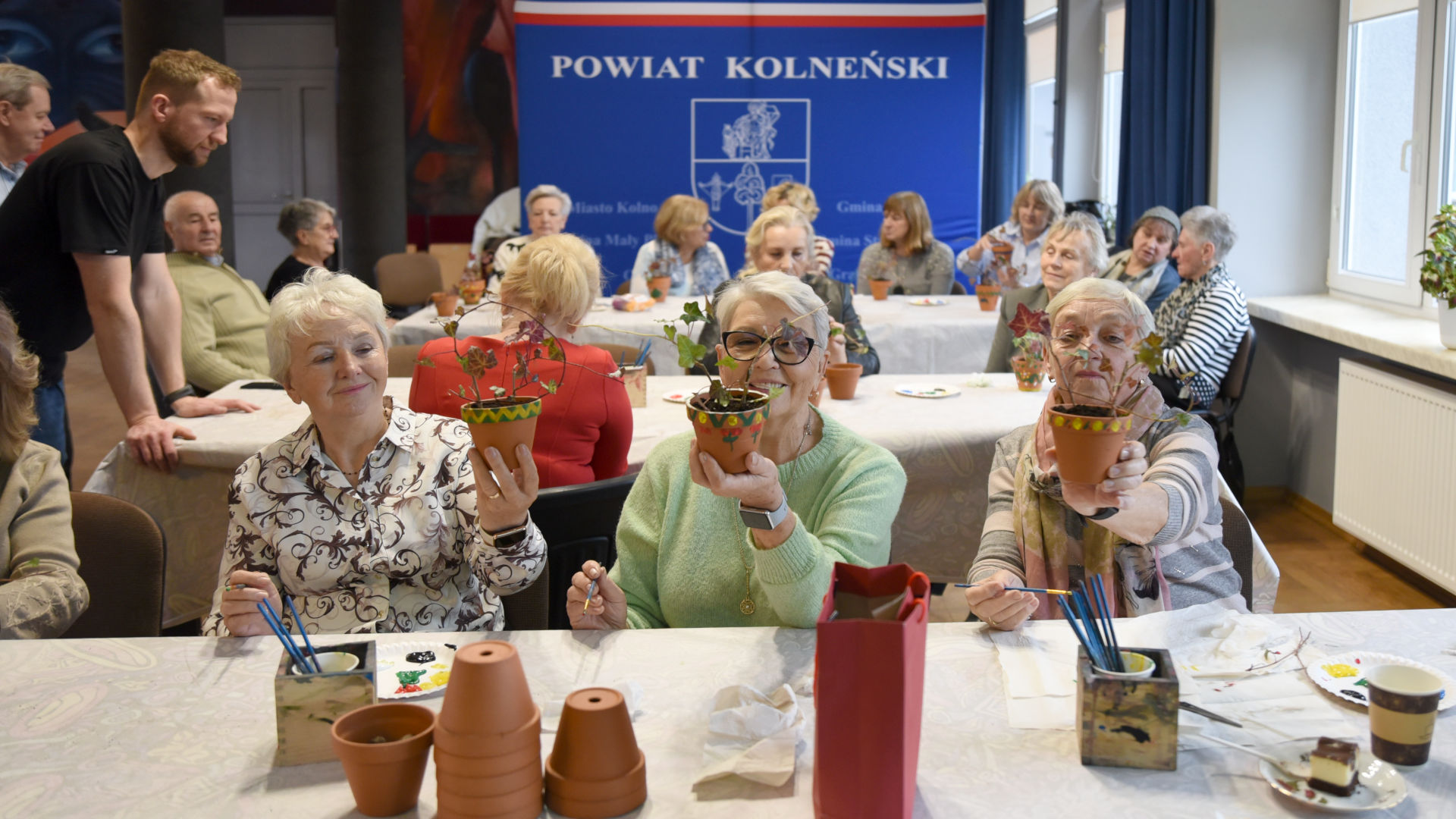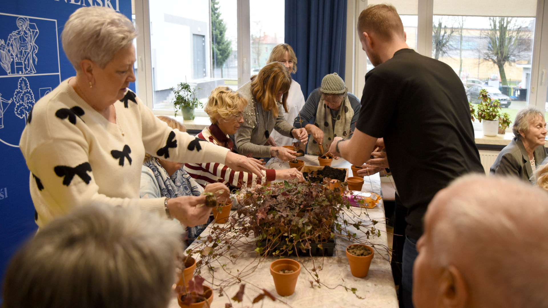 W drugiej części spotkania seniorzy mogli zaangażować się w działania praktyczne. Na przygotowanych stanowiskach sadzili bluszcz – roślinę o właściwościach antysmogowych, który następnie ozdabiali własnoręcznie malowanymi doniczkami. Dzięki temu każdy uczestnik zabrał do domu nie tylko wiedzę, ale również osobistą, ekologiczną pamiątkę. Seniorzy zgodnie podkreślali, że zdobyta wiedza i praktyczne umiejętności z pewnością przydadzą im się na co dzień.