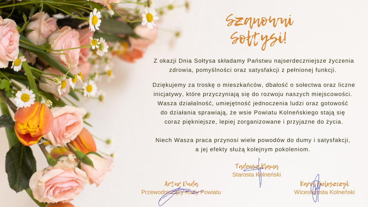 Z okazji Dnia Sołtysa składamy Państwu najserdeczniejsze życzenia zdrowia, pomyślności oraz satysfakcji z pełnionej funkcji.