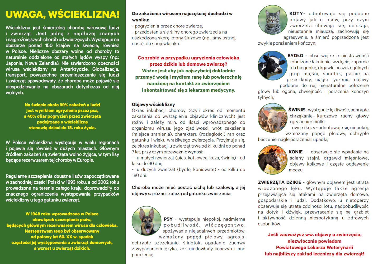 Powiatowy Lekarz Weterynarii w Kolnie, w ramach działań informacyjnych oraz przypomnienia o zasadach profilaktyki, zamieszcza ulotkę dotyczącą wścieklizny: